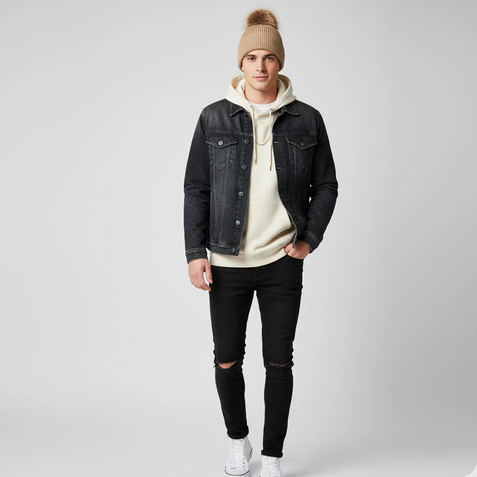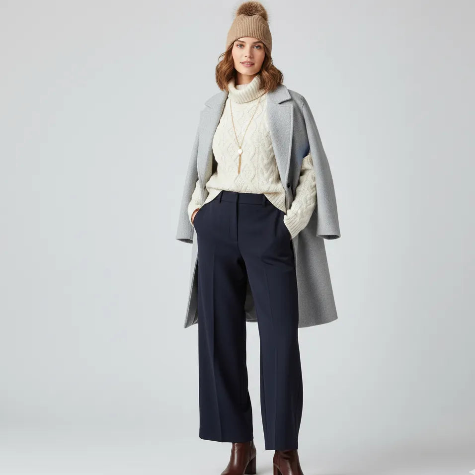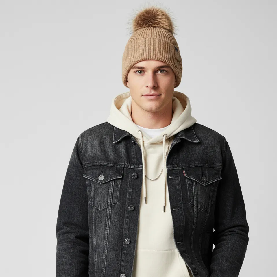 Chic Pompom Accent: To complete the trendy, cozy look, the beanie is crowned with a fluffy, coordinating faux fur pompom, adding a playful yet sophisticated touch.